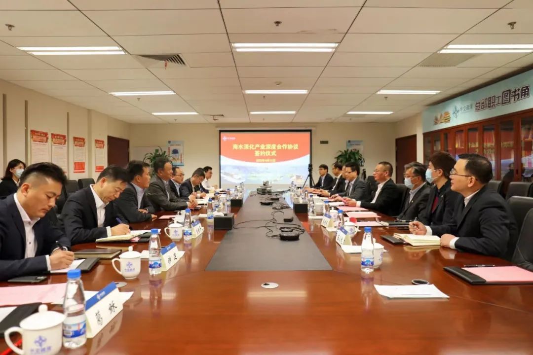 中国交建国际工程分公司副总经理张亚舟、王晓锋及有关部门负责人参加会议。中交疏浚副总裁关巍、黄道金,公司有关部门、国际事业部(香港海投)负责人参加会见。根据协议,双方将按照优势互补、互利共赢、长期合作、共同发展的原则,在海水淡化业务领域开展全方位合作。